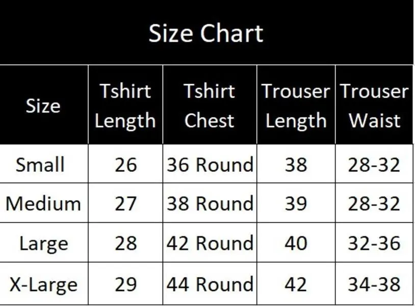 | Size | 👕 T-Shirt Length | 📏 Chest (Round) | 👖 Trouser Length | 🧵 Waist Range |