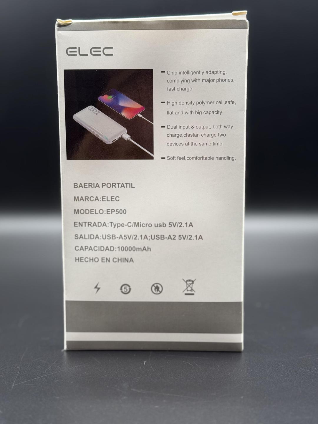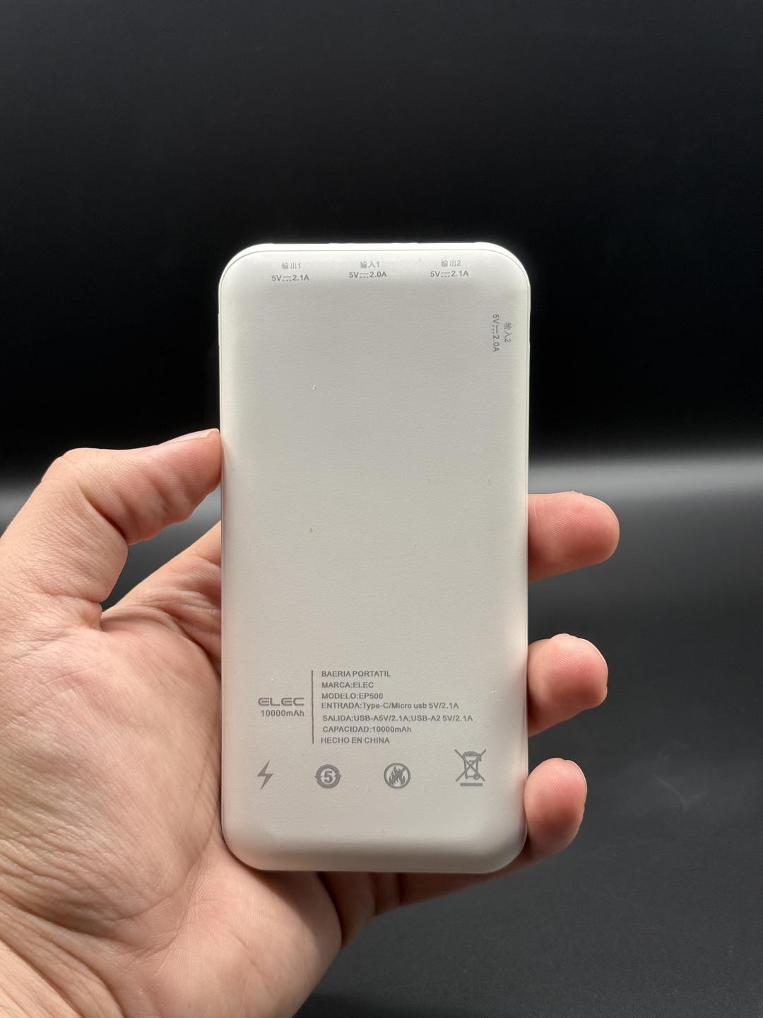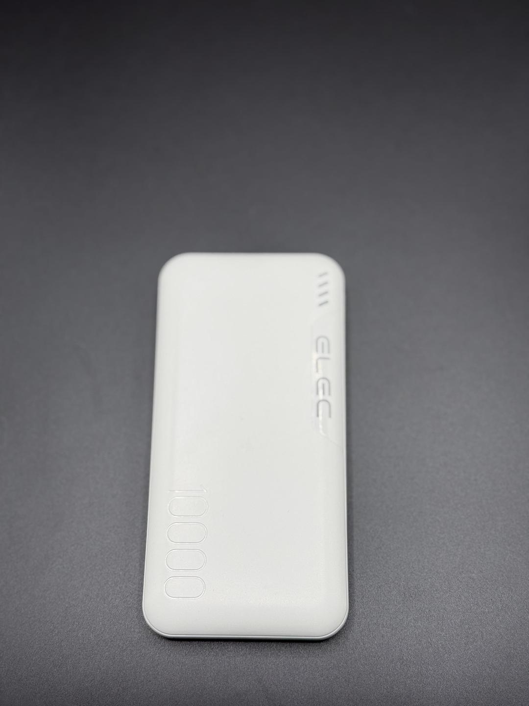 - Sleek white matte body with embossed branding (“ELEC” and “10000”) adds premium appeal.